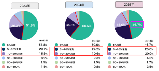 一方で「5~30%未満」(「5~10%未満」+「10~30%未満」)の合計は45.0%となり、前年の34.8%から+10.2pt増加しました。暗号資産への投資配分を「少額から一段引き上げる」動きが広がっており、暗号資産を資産形成の一部として継続的・積極的に組み込む層が増えている可能性が示唆されます。