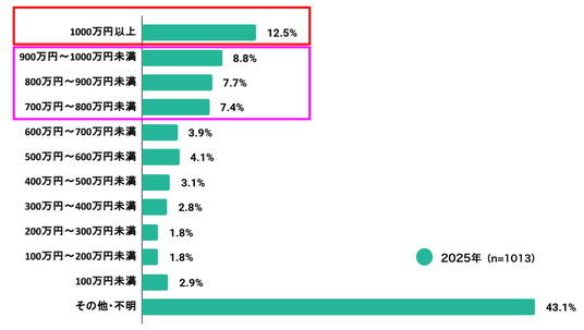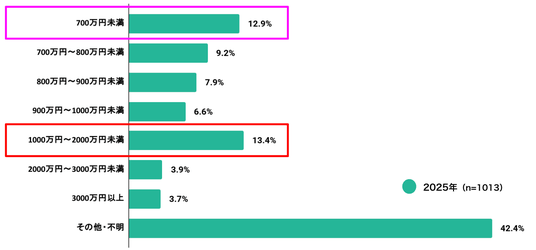 「資産運用している」と答えた方へ【Q 2026年1月1日から12月31日において、ビットコイン価格(1BTC)の円建て予想最低値を教えてください】では、「1000万円以上」が12.5%で最多となりました。続いて「900万円~1000万円未満」8.8%、「800万円~900万円未満」7.7%、「700万円~800万円未満」7.4%が並び、最低値を「700万円以上」と見る回答が中心的なボリュームゾーンとなっています。
