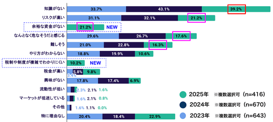 新設項目「余裕のある資金がないため」21.2%が上位に入り、暗号資産に限らず投資開始の前提となる資金面が引き続き課題として挙げられる結果となりました。