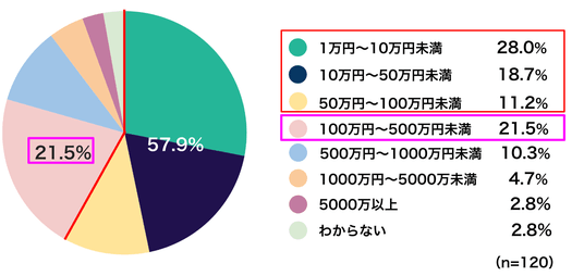 「暗号資産」と答えた方へ【Q 現在、保有している暗号資産の総額を日本円で教えてください】では、「1万円~10万円未満」が28.0%で最多となり、次いで「100万円~500万円未満」が21.5%となりました。全体では「100万円未満」が57.9%と約6割を占め、暗号資産を少額から保有する層が中心であることがうかがえます。