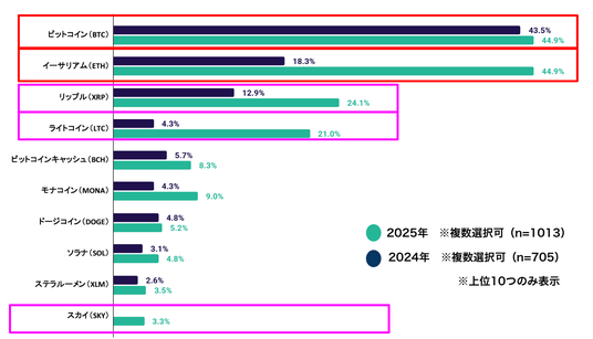 「資産運用している」と答えた方へ【Q 2026年に最も期待している暗号資産銘柄は?】では、「ビットコイン(BTC)」が43.5%で引き続き最多となりました。加えて今年は「イーサリアム(ETH)」が44.9%と前年から大幅に上昇し、BTCと並ぶトップ水準へ急伸しています。