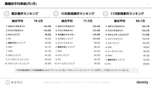 11月は累計案件と10月新規案件にはランクインしていない「セキュリティエンジニア(111.8万円)」が3位にランクインしました。