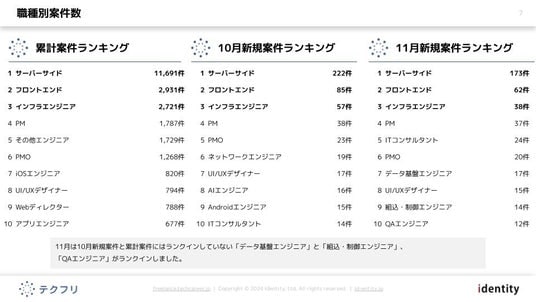 11月は10月新規案件と累計案件にはランクインしていない「データ基盤エンジニア」と「組込・制御エンジニア」、「QAエンジニア」がランクインしました。