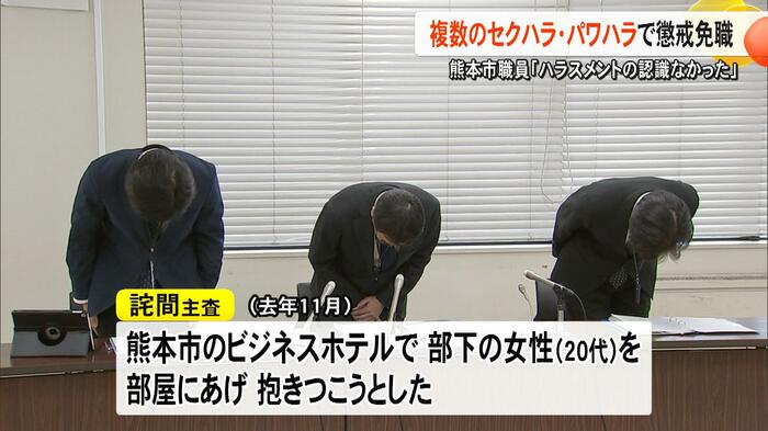 部下の女性をホテルの部屋に連れ込み、抱きつこうとするなど複数のセクハラやパワハラを行った40代の男の職員を、熊本市は懲戒免職処分とした。職員は「ハラスメントの認識はなかった」と話しているという。