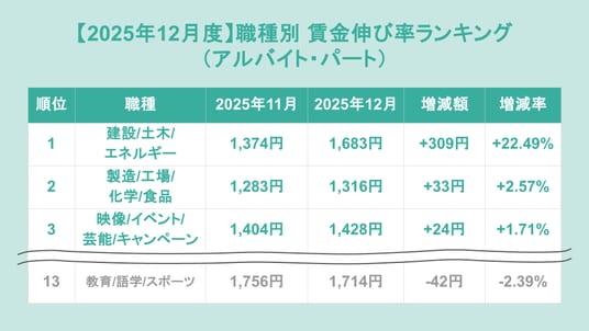 アルバイト・パートの職種別賃金伸び率ランキング(前月比)トップ3は、1位が「建設/土木/エネルギー」(増加額+309円、増加率+22.49%)、2位が「製造/工場/化学/食品」(増加額+33円、増加率+2.57%)、3位が「映像/イベント/芸能/キャンペーン」(増加額+24円、増加率+1.71%)でした。