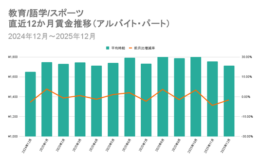 一方、「教育/語学/スポーツ」では2024年12月から2025年10月まで概ね1,700円台から1,800円台の水準で推移していましたが、2025年11月に1,756円、12月には1,714円へと連続して下落しました。