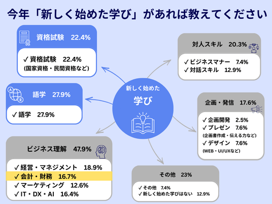 具体的にどのような学びを行っているかを見ると、「語学(27.9%)」「資格試験(22.4%)」に加え、「経営・マネジメント(18.9%)」「会計・財務(16.7%)」が上位を占めました。 これらは特定の企業内でのみ通用するスキルではなく、業界や業種を超えて通用する「ポータブルスキル」の代表格です。転職意識の高まりと連動し、会社が変わっても通用スキルへの投資が加速しています。