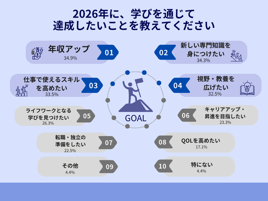 2026年に学びを通じて達成したいこととして、「年収アップ」が最も多く、「新しい専門知識を身につけたい」「仕事で使えるスキルを高めたい」「視野・教養を広げたい」など、自身のスキルアップをベースとする学びが30%を超える結果となりました。