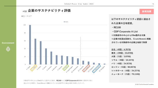 このほか、スタートアップの増加も評価されました。また、企業のサステナビリティ評価や生物多様性といった新しい指標も加わり、環境面での評価も上昇しています。