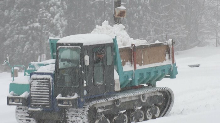 あわすのスキー場では、せっかく降った雪が溶けないよう、周辺の駐車場などから集めた数十トンの雪を追加でゲレンデに投入する作業が行われている。27日からの連続営業を目指し、準備が急ピッチで進められていた。