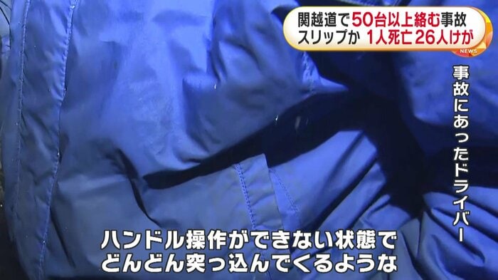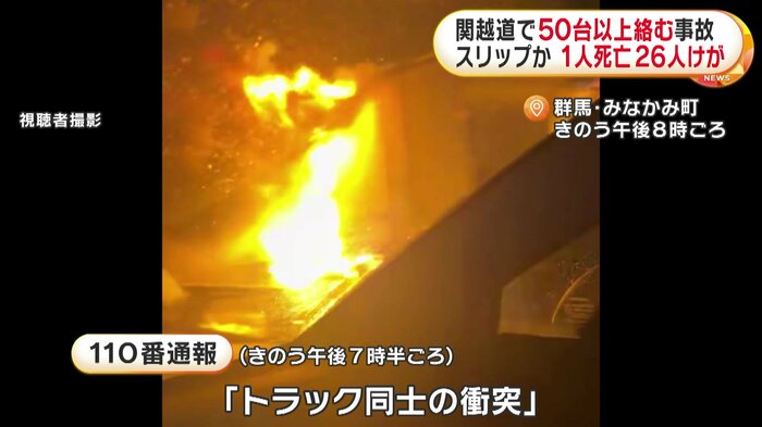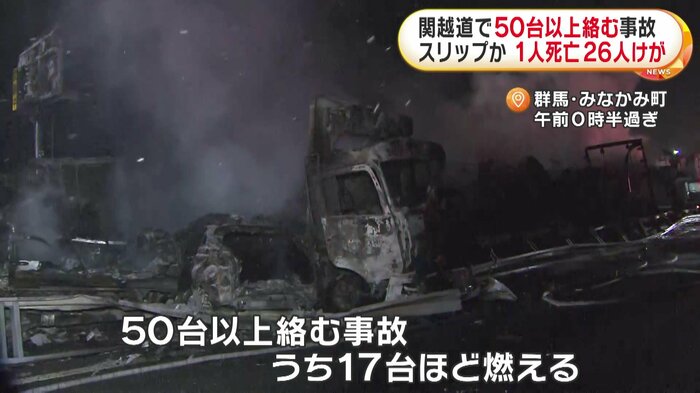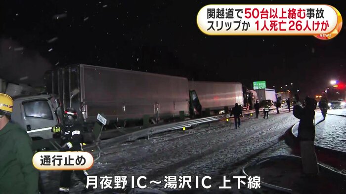 群馬県の関越自動車道で26日夜、トラックなど50台以上が絡む事故があり、女性1人が死亡、26人がけがをした。