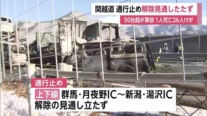 群馬県の関越自動車道で26日夜、トラックなど50台以上が絡む事故があり女性1人が死亡、26人がけがをした。この事故の影響で、27日午前11時50分現在も関越道の一部区間で通行止めが続いている。