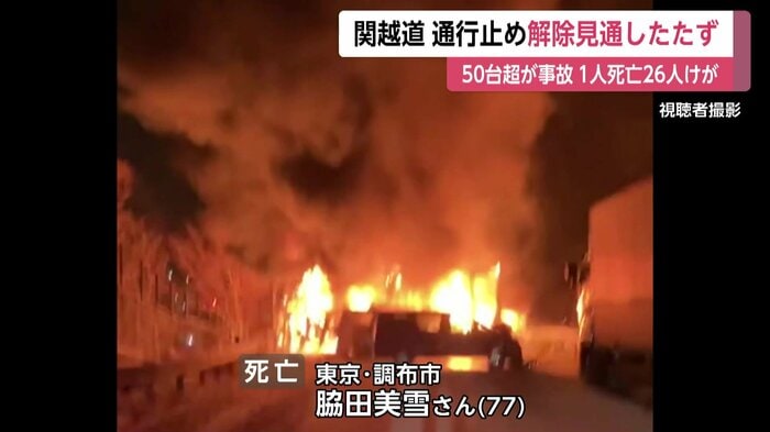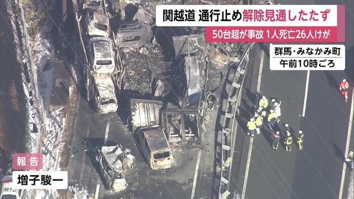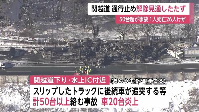 26日午後7時半ごろ、群馬県の関越道下りの水上インターチェンジ付近でスリップしたトラックに後続車が追突するなど、あわせて50台以上が絡む事故となり、車20台が炎上した。