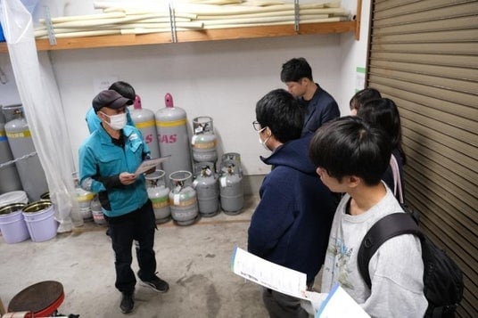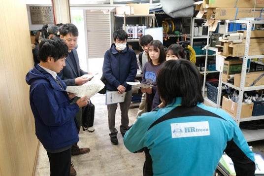 当日は、学術研究院社会文化科学学域(経済)の天王寺谷達将准教授のゼミに所属する学生ら4人が参加。現地では同社の小原章弘代表取締役より、再生フロンの回収から再利用までのプロセスについて詳細な説明がありました。学生たちは、再生の各工程や使用される機器の仕組み、品質管理の工夫などを間近で観察し、活発な質疑応答を交わしました。