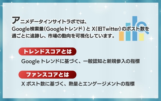 これらをGoogle検索量から算出した「トレンドスコア」(一般認知度)と、Xポスト数から算出した「ファンスコア」(ファンの熱量)の2軸で毎週追跡した。
