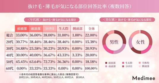 今回の調査では、抜け毛・薄毛の悩みは、年代や性別によって気になりやすい部位や悩み方に違いがあることが明らかになりました。