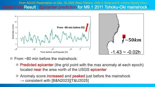 学会発表: 世界初の震央推定としてAGU25(American Geophsyical Union 2025, New Orleans, USA)で、2025年12月16日に口頭発表(S. Ikeda-K. Umeno)するとともに、その直後の12月20日には東京で開催された日本地震予知学会で招待講演(梅野健)にて紹介しました。