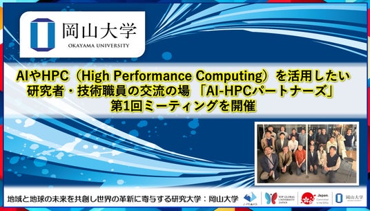 国立大学法人岡山大学(本部:岡山市北区、学長:那須保友)は、AIおよびHigh Performance Computing(HPC)をキーワードに、研究者・技術者の交流を促進し、新たな共同研究や研究拠点形成を目指す「AI-HPCパートナーズ」の第1回ミーティングを、2025年11月26日に本学津島キャンパスの五十周年記念館2階大会議室にて、ハイブリッド形式で開催しました。AI-HPCパートナーズは、AI・データ駆動計算・シミュレーション研究に関心を持つ研究者・技術職員が集まり、ノウハウ共有や共同研究創出を目的として設立された研究拠点です。当日は、教員、技術職員、URA、コーディネーター(産学連携、学術研究)など多様な参加者約40人が集いました。