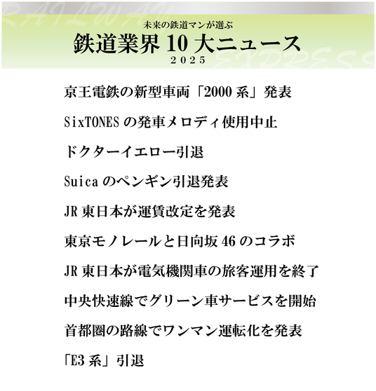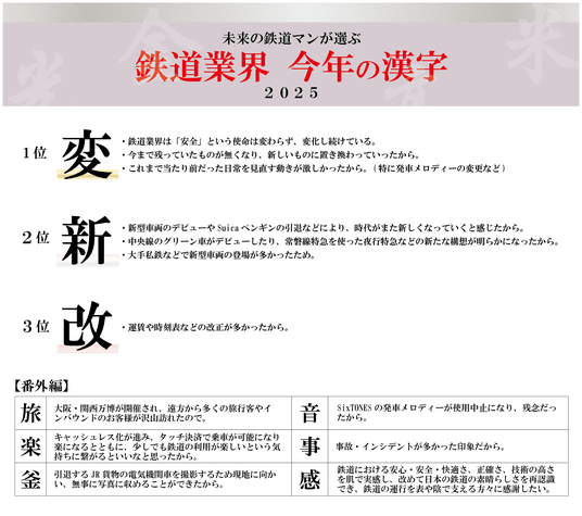 本調査では、鉄道業界を目指す学生が「本当に印象に残った鉄道ニュース」や、「2025年の鉄道業界を象徴する漢字」を選出しています。