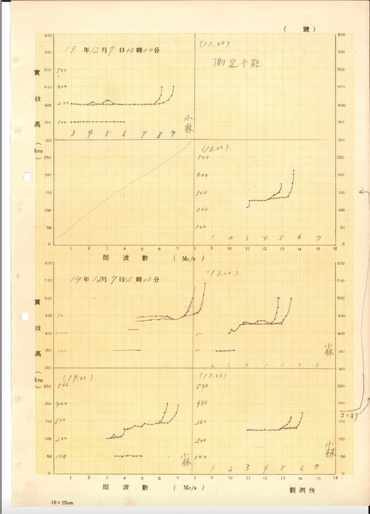 図2: 公開された「当時」の手書きのイオノグラムPart 2。当時、平塚(神奈川県)にあった電離層観測装置(イオノゾンデ)で観測されたイオノグラム。電子数密度は地震発生当日(1944年12月7日)の12時30分(日本時間)に臨界周波数が急増(7.8MHz)し、電子数密度が急増していることが示されています。イオノグラム周波数は海軍方式であり、横軸は右から左へ周波数が増加します。当時、日本は稀に見る数の電離層観測装置による観測網を展開し、世界に先駆ける研究成果を蓄積していましたが、陸軍方式(左→右)と海軍方式(右→左)のイオノグラムが標準化されていませんでした。