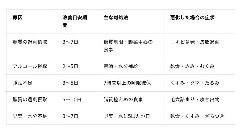 調査では41.3%が3日以内の改善を希望していましたが、肌のターンオーバーを考慮すると最低でも3~7日は必要です。食事を野菜中心に切り替え、十分な睡眠と水分摂取を続けることで、多くの場合1~2週間で改善します。ただし、2週間以上改善しない場合は皮膚科での治療をお勧めします。