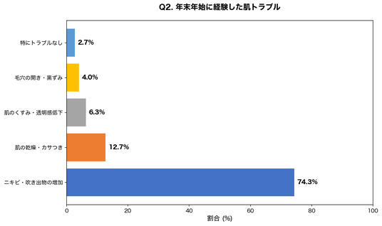 ・年末年始に肌トラブルを経験した人の74.3%が「ニキビ・吹き出物の増加」を実感