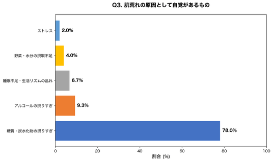 ・肌荒れの原因として78.0%が「糖質・炭水化物の摂りすぎ」を自覚