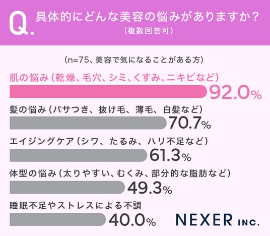 乾燥や毛穴、シミ、くすみなどの「肌の悩み」を抱えている方が92%と群を抜いた結果になりました。