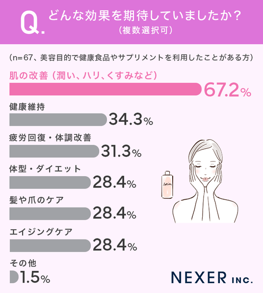 67.2%が潤いやハリ、くすみなど「肌の改善」を期待して利用したという結果になりました。