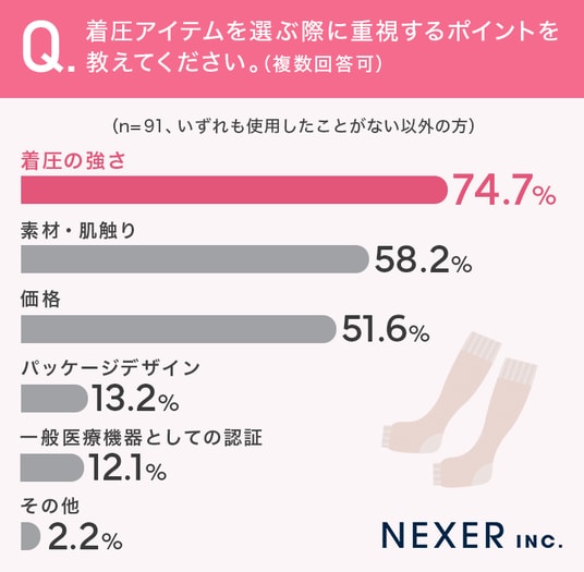 74.7%の方が着圧アイテムを選ぶ際に「着圧の強さ」を重視していることがわかりました。