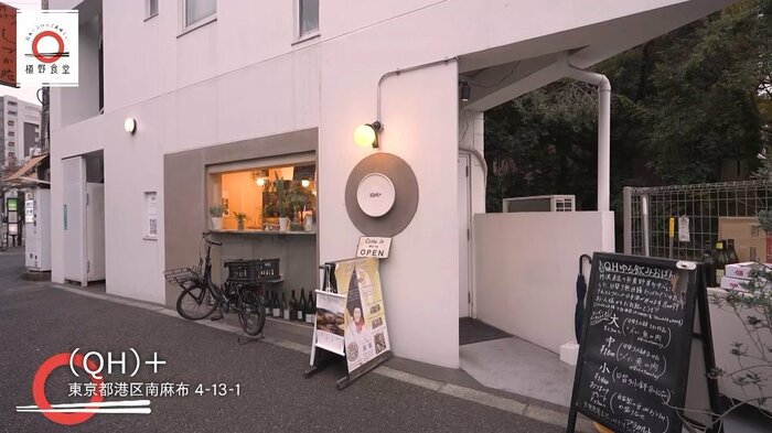 2011年に開店した「(QH)+」があるのは、広尾駅から徒歩5分、天現寺橋交差点に建つ特徴的な三角ビルの1階。店内は、白とベージュを基調とした清潔感あふれ、カウンター9席のこじんまりとした空間には、もともとデザイナーだった店主のセンスが光る。
