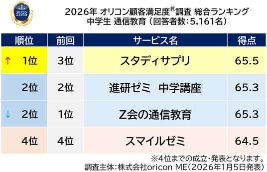 『中学生 通信教育』総合ランキング(2026年 オリコン顧客満足度(R)調査)