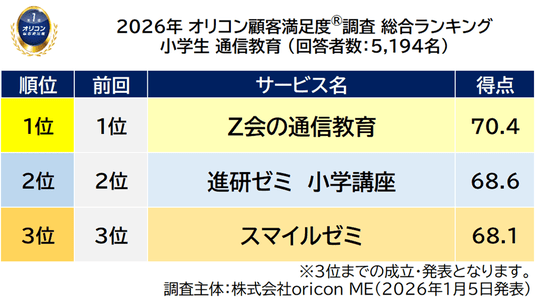オリコン株式会社(本社:東京都港区 代表取締役社長:小池 恒、略称:オリコン)は、グループ会社である株式会社oricon MEが、実際のサービス利用者を対象に第三者の立場で実施した『通信教育(小学生/中学生/高校生)』についての顧客満足度調査の結果を、2026年1月5日(月)14時に「オリコン顧客満足度(R)」公式サイト内にて発表いたしました。ランキングは以下の通りとなりました。