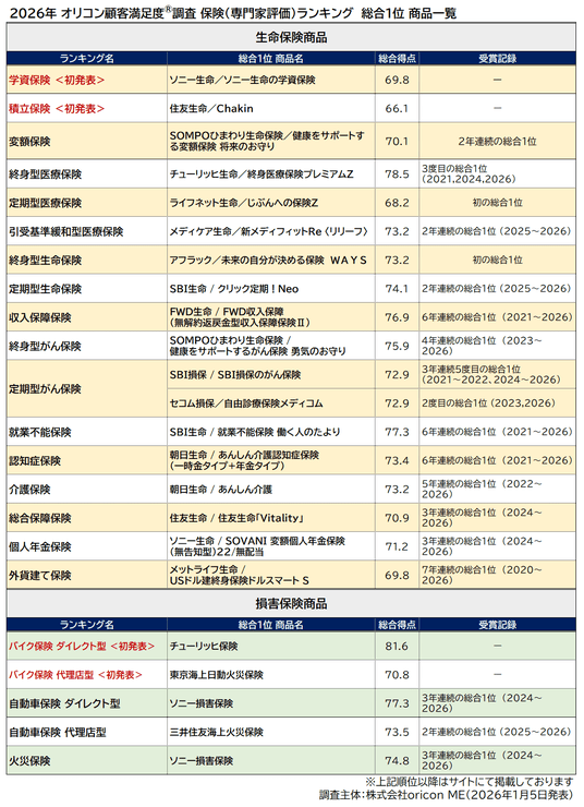 2026年1月発表 オリコン顧客満足度(R)調査 専門家評価の生命保険商品ランキング