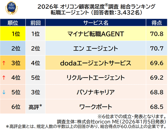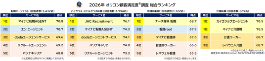 オリコン株式会社(本社:東京都港区 代表取締役社長:小池 恒、略称:オリコン)は、グループ会社である株式会社oricon MEが、実際のサービス利用者を対象に第三者の立場で実施した『転職エージェント』『ハイクラス・ミドルクラス転職』『看護師転職』『介護転職』についての顧客満足度調査の結果を、2026年1月5日(月)14時に「オリコン顧客満足度(R)」公式サイト内にて発表いたしました。ランキングは以下の通りとなりました。