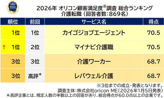 『介護転職』総合ランキング(2026年 オリコン顧客満足度(R)調査)