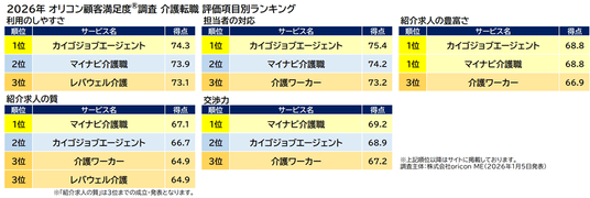 『介護転職』評価項目別ランキング(2026年 オリコン顧客満足度(R)調査)