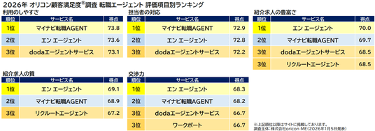 『転職エージェント』評価項目別ランキング(2026年 オリコン顧客満足度(R)調査)