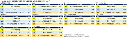 『子ども英語教室 幼児』評価項目別ランキング(2026年 オリコン顧客満足度(R)調査)