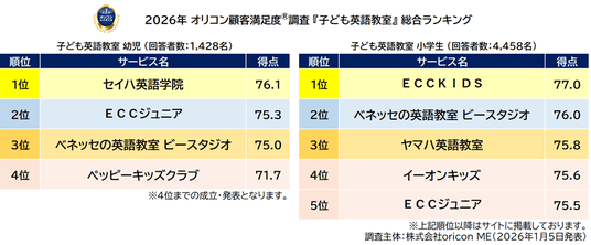 オリコン株式会社(本社:東京都港区 代表取締役社長:小池 恒、略称:オリコン)は、グループ会社である株式会社oricon MEが、実際のサービス利用者を対象に第三者の立場で実施した『子ども英語教室(幼児/小学生)』についての顧客満足度調査の結果を、2026年1月5日(月)14時に「オリコン顧客満足度(R)」公式サイト内にて発表いたしました。ランキングは以下の通りとなりました。