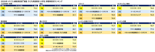『子ども英語教室 小学生』評価項目別ランキング(2026年 オリコン顧客満足度(R)調査)