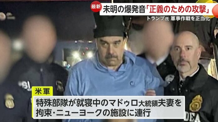 アメリカ軍の軍用機がレーダー基地を攻撃し、特殊部隊が就寝中だったマドゥロ大統領夫妻を拘束。ニューヨークの施設に連行した。