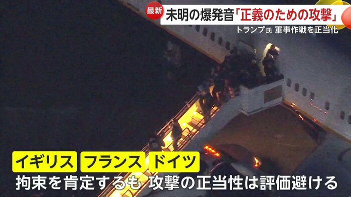 一方、イギリス、フランス、ドイツの首脳はそれぞれ、マドゥロ氏の拘束を肯定するコメントを出したが、攻撃の正当性については評価を避けている。