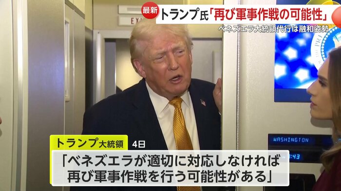 さらにトランプ大統領は4日、「ベネズエラが適切に対応しなければ、再び軍事作戦を行う可能性がある」と、さらなる攻撃も警告。