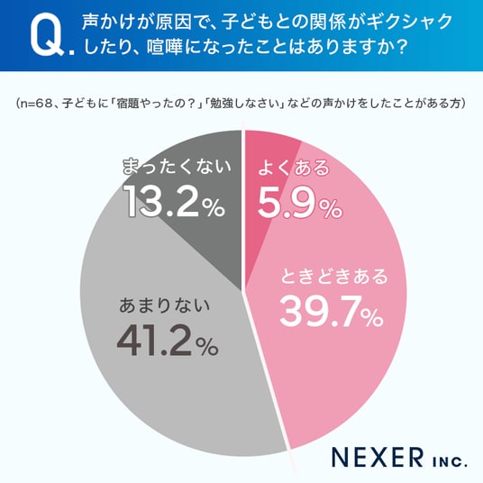 今回の調査では、約7割の保護者が子どもに「宿題やったの?」「勉強しなさい」といった声かけをしており、そのうち約半数が声かけによって子どもとの関係がギクシャクした経験があることがわかりました。