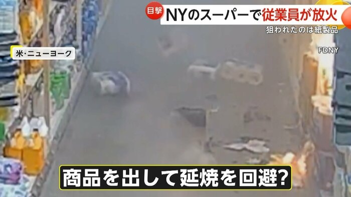 アメリカ・ニューヨークのスーパーで、突然、商品棚から火が上がる火事が起きた。地元消防によると、従業員の男が商品に火をつける姿が防犯カメラに記録されていたという。