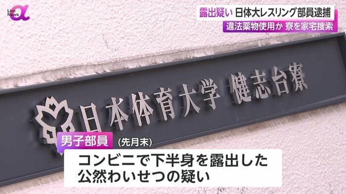 日本体育大学のレスリング部の男子部員が、横浜市のコンビニで下半身を露出し逮捕されていたことがわかりました。男子部員は事件前に違法薬物を使用していた可能性があり、警察が鑑定を進めています。