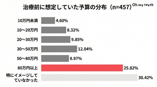 1. 【新年のハードル】約3割が「いくらかかるか見当がつかない」治療前に想定していた予算について質問したところ、最も多かったのは「80万円以上(25.8%)」でした。 矯正治療には「高額」というイメージが定着している一方、「特にイメージしていなかった(30.4%)」という回答も多く見られました。