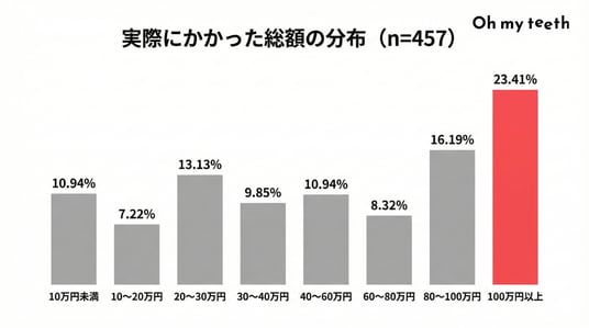 実際に支払った総額を見ると、「100万円以上」が23.4%で最多となり、全体矯正などの本格的な治療には依然として相応の費用がかかることが分かります。
