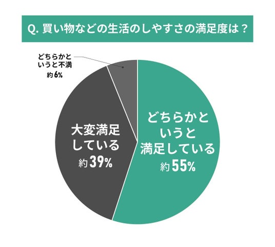 生活のしやすさについては約94%の住民が満足しており、高い評価を得ています。スーパーやドラッグストア、コンビニなど日常生活に必要な店舗が充実している点が評価されています。